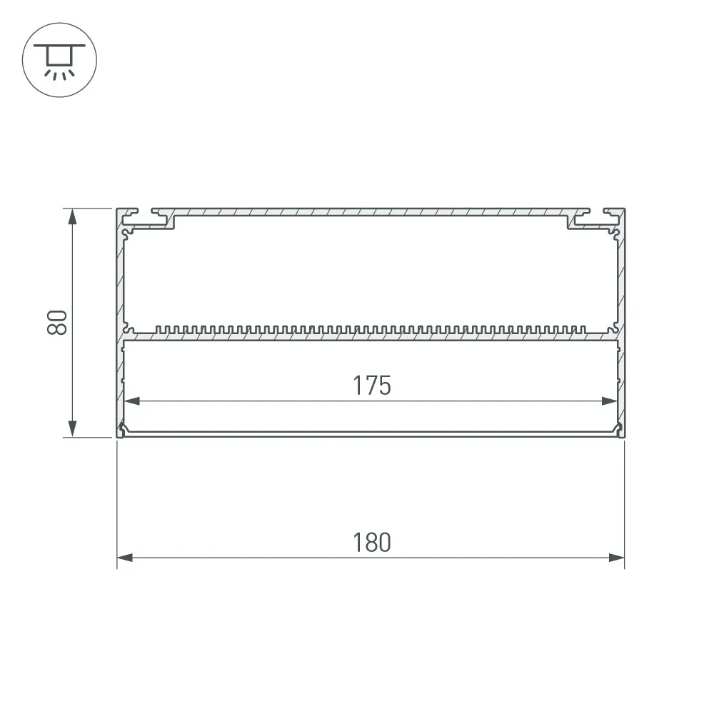 Комплект с экраном. Алюминиевый анодированный подвесной профиль для светодиодных лент и линеек, с отсеком для блока питания (высота отсека 40 мм). Габаритные размеры (L×W×H): 2000x180x80 мм. Ширина площадки для ленты 175 мм. Аксессуары приобретаются отдельно. Цена за комплект: профиль - 2 м, экран - 2 м.