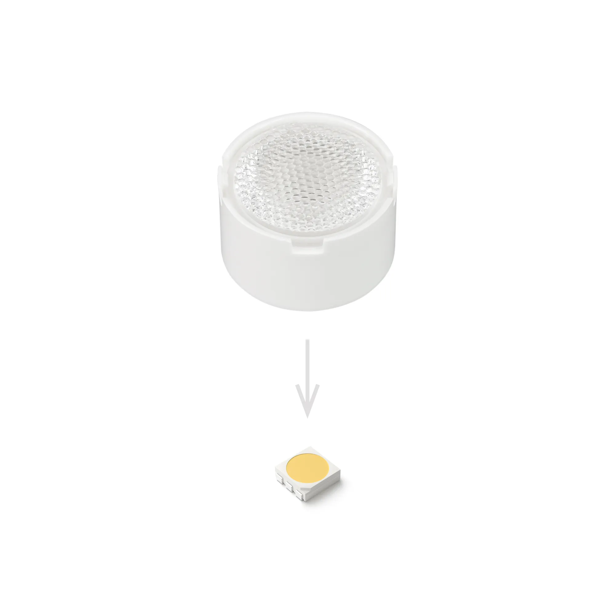 Поставка под заказ от 1800 шт. Одиночная линза со съемным холдером белого цвета для светодиодов SMD: 2525, 2835, 3030, 3535, 5050. Угол обзора: вертикальный 45°, прозрачная микропризма. Материал PMMA. Диаметр 19.5 мм, высота 11.76 мм.