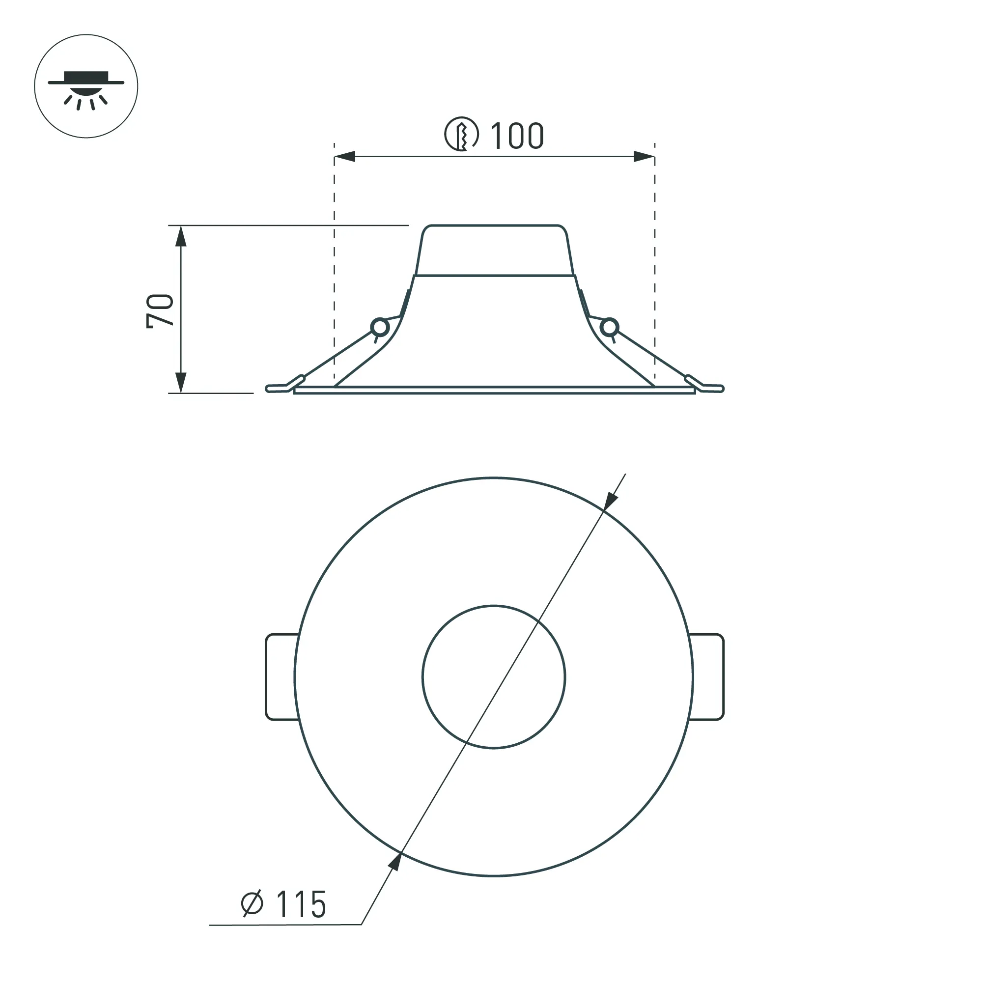 Встраиваемый светильник даунлайт с интегрированным в корпус драйвером. Мощность 10 Вт, св. поток 605 лм, 60 лм/Вт, тёплый 3000 K, CRI>90, угол 100°, напряжение питания 230 В. Чёрный круглый корпус из алюминия, степень защиты IP20. Размер: диаметр 115 мм, высота 70 мм. Монтаж встраиваемый, установочное отверстие: диаметр 100 мм. Пульсация <2%.