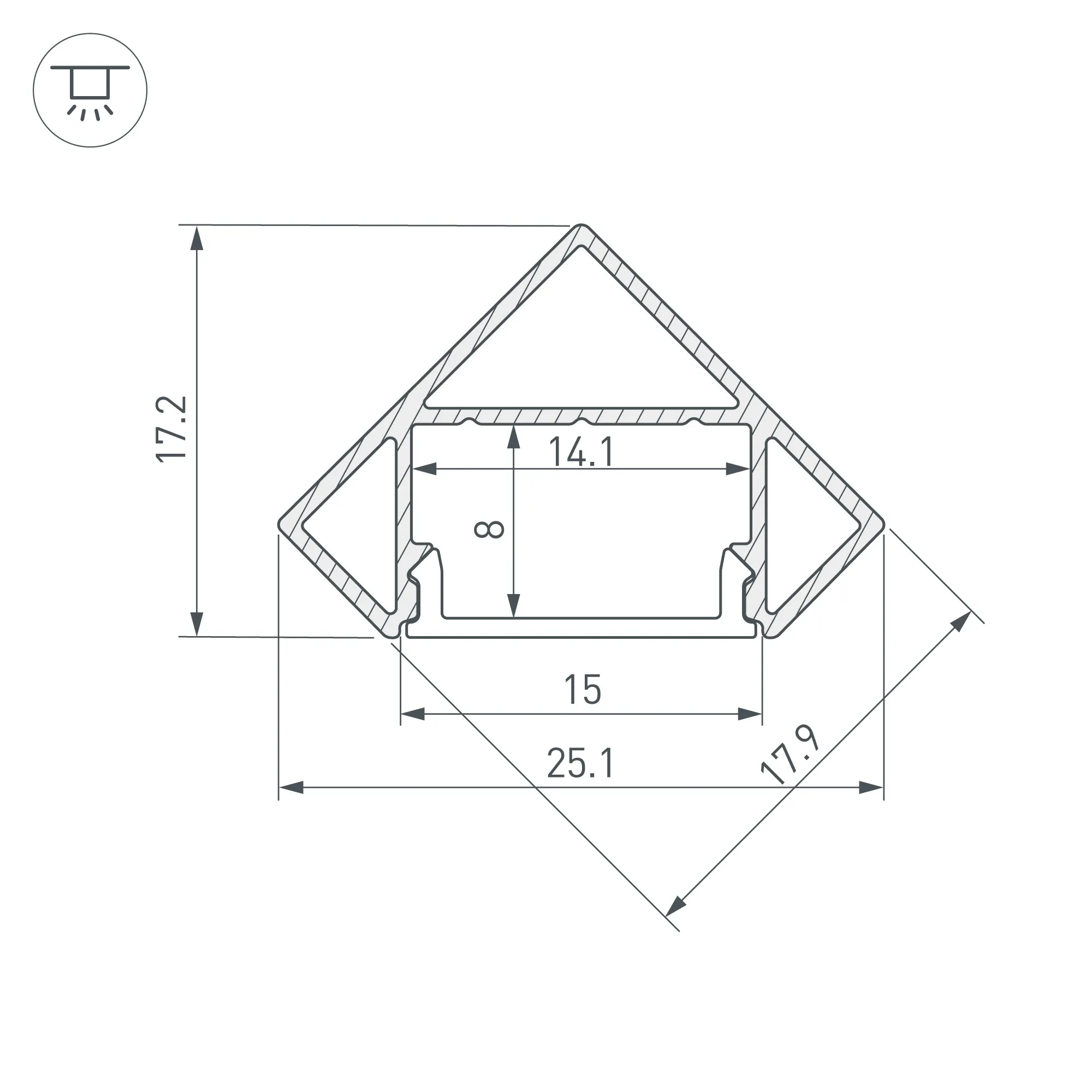 Алюминиевый анодированный угловой профиль для светодиодных лент и линеек. Габаритные размеры (L×W×H): 2000x17,9x17,9 мм. Ширина площадки для ленты 13,9 мм. Экраны, заглушки и другие аксессуары приобретаются отдельно. Цена за 1 метр.