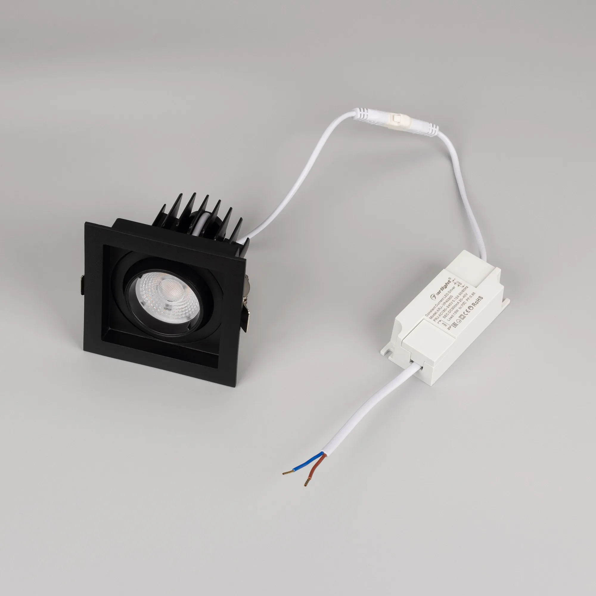 Встраиваемый карданный светильник. Мощность 12 Вт, св. поток 1394 лм, 116 лм/Вт, дневной 4000 K, CRI>92, угол 40°, напряжение питания 230 В. Чёрный корпус из алюминия, чёрная вставка, степень защиты IP20. Размер: длина 90 мм, ширина 90 мм, высота 80 мм. Монтаж встраиваемый, установочное отверстие: длина 75 мм, ширина 75 мм. Драйвер 27-40 В, 300 мА, пульсация <2%.